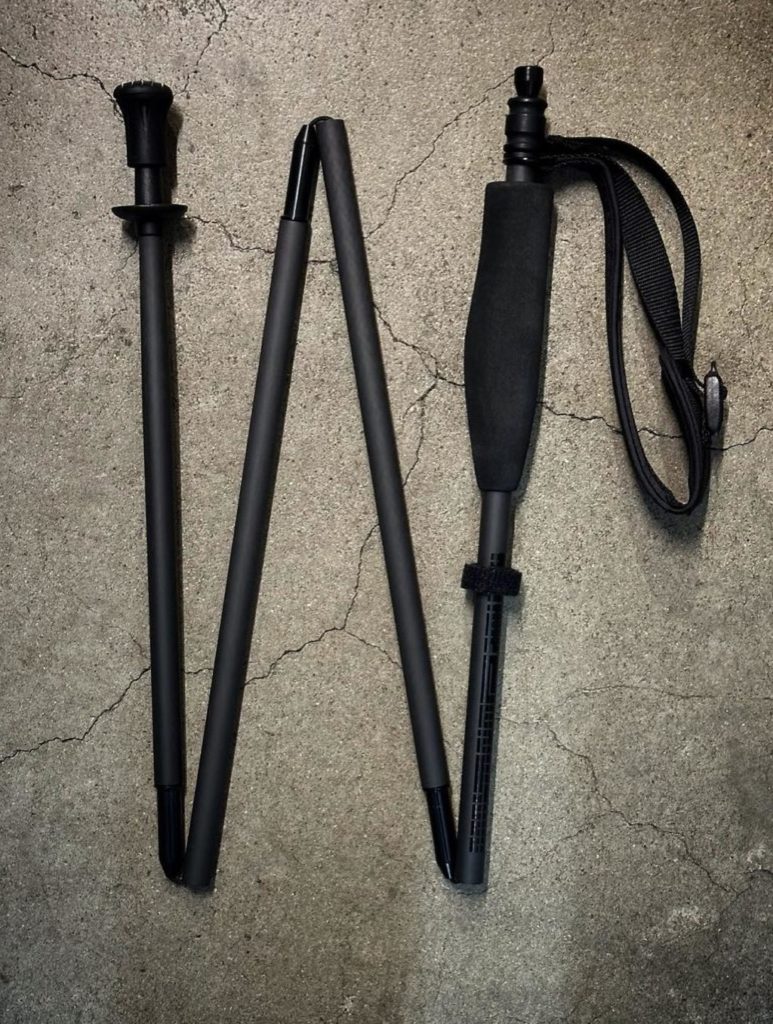 私の身長は177cmで長さは110cmを使用した。折りたたむと僅か33cmになりバックパックのサイドポケットなどに差し入れても携行しやすい長さだ。