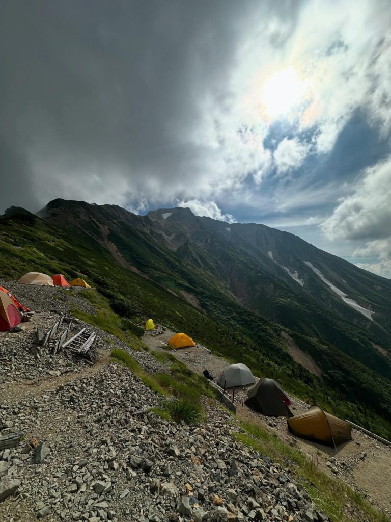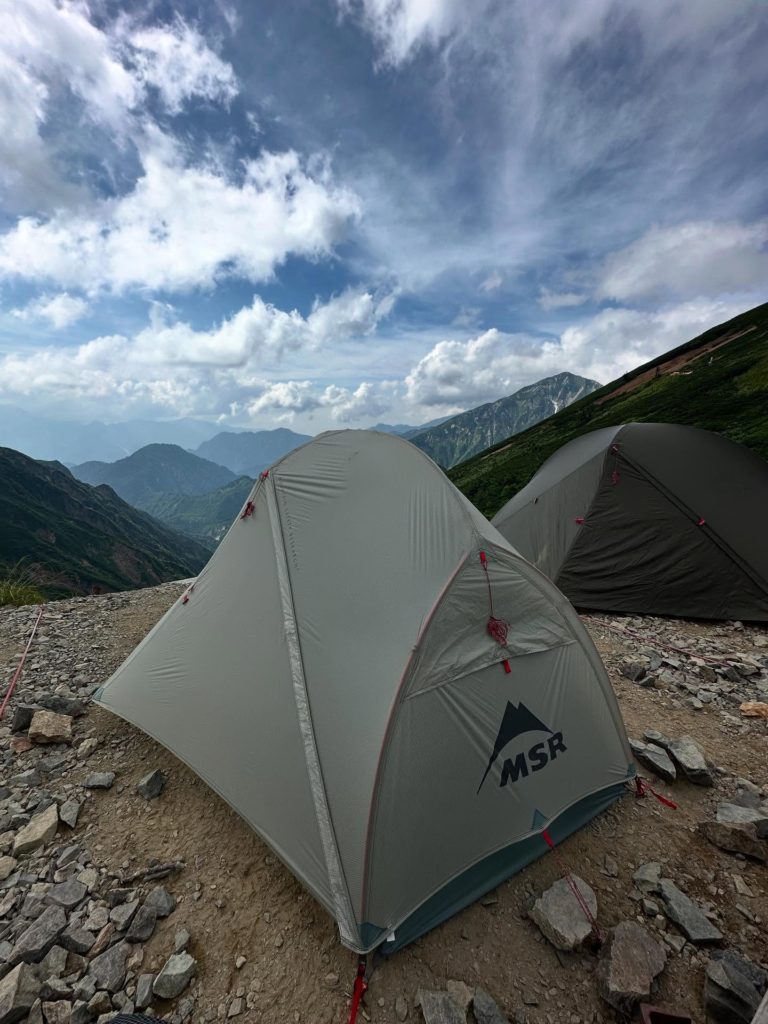 テント場は斜面を段々に区切ったような地形にあり、平坦な場所があり、ペグも打ちやすい。私たちは下段にテントを設営した。
