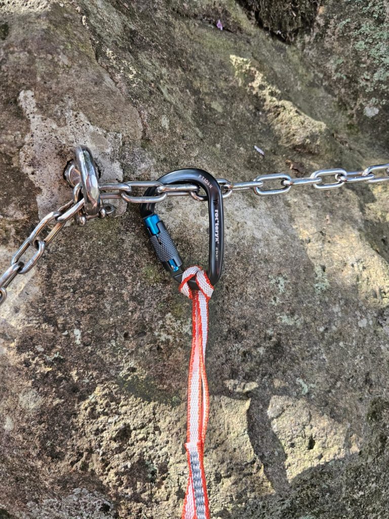 2班に別れてそちらでは簡易ハーネスの作り方、クサリ場の通過でのセルフビレイの掛け変えを練習です。