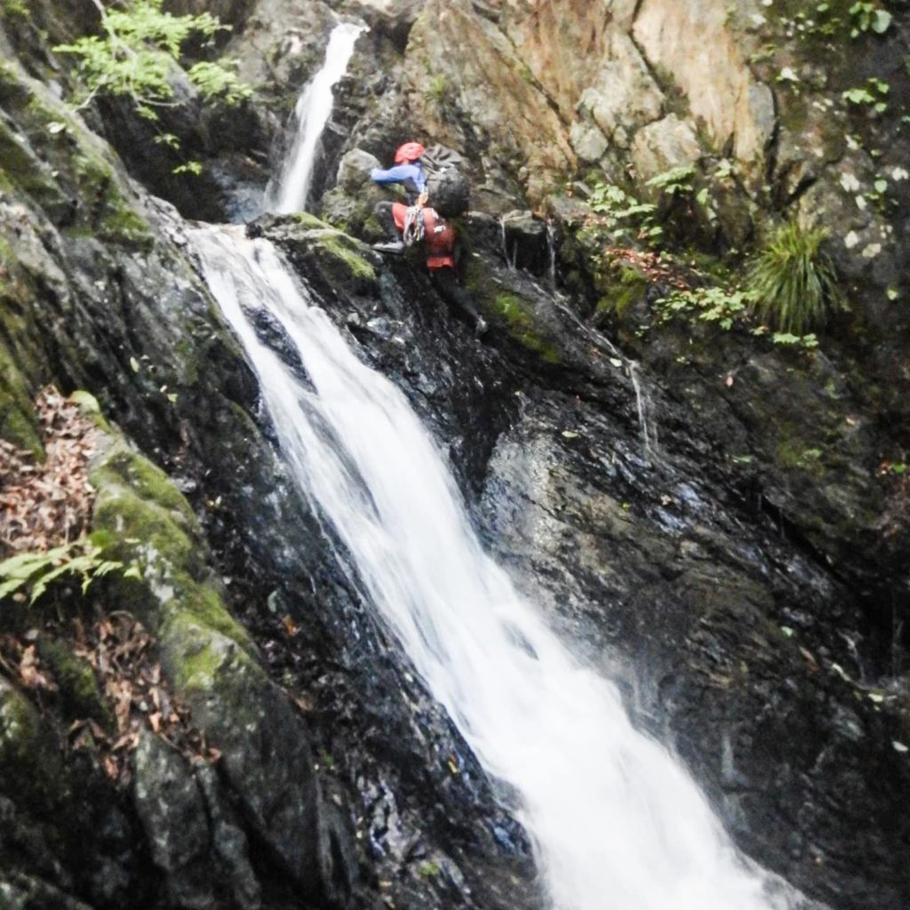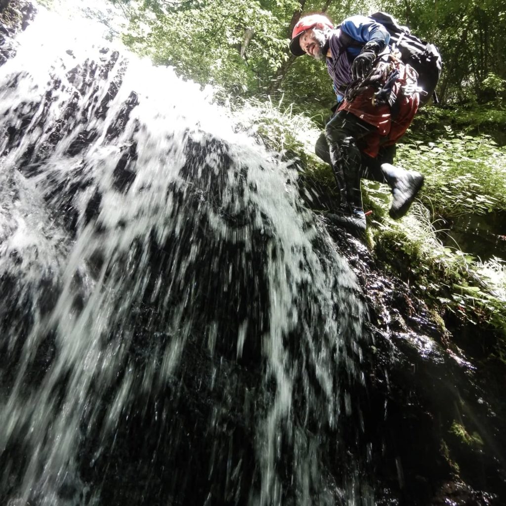 装備のポイントとしては、坊主谷のような沢登りでは、沢靴(フェルトソールやラバーソール)とヘルメットは必須。