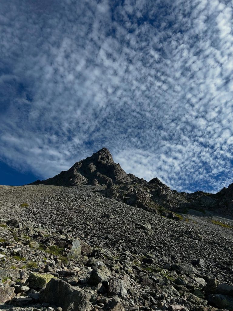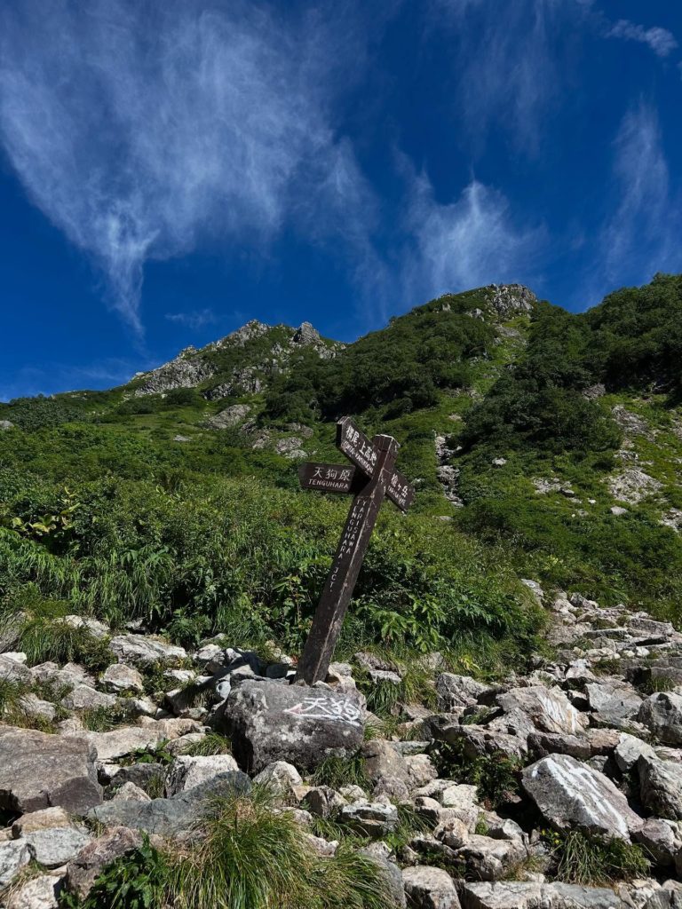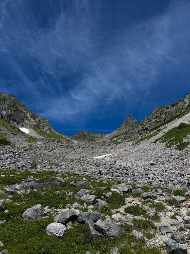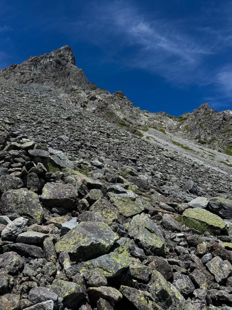 翌日は、山頂にある槍ヶ岳山荘のキャンプ場を目指しました。ババ平-天狗原-殺生ヒュッテを経て槍ヶ岳山荘へ。木陰がない場所は日差しが強く、とても熱く、道のりは長く、槍の穂先が見えてからも長く…水分、塩分、エネルギー、特に水分、塩分補給に気をつけながら進みました。