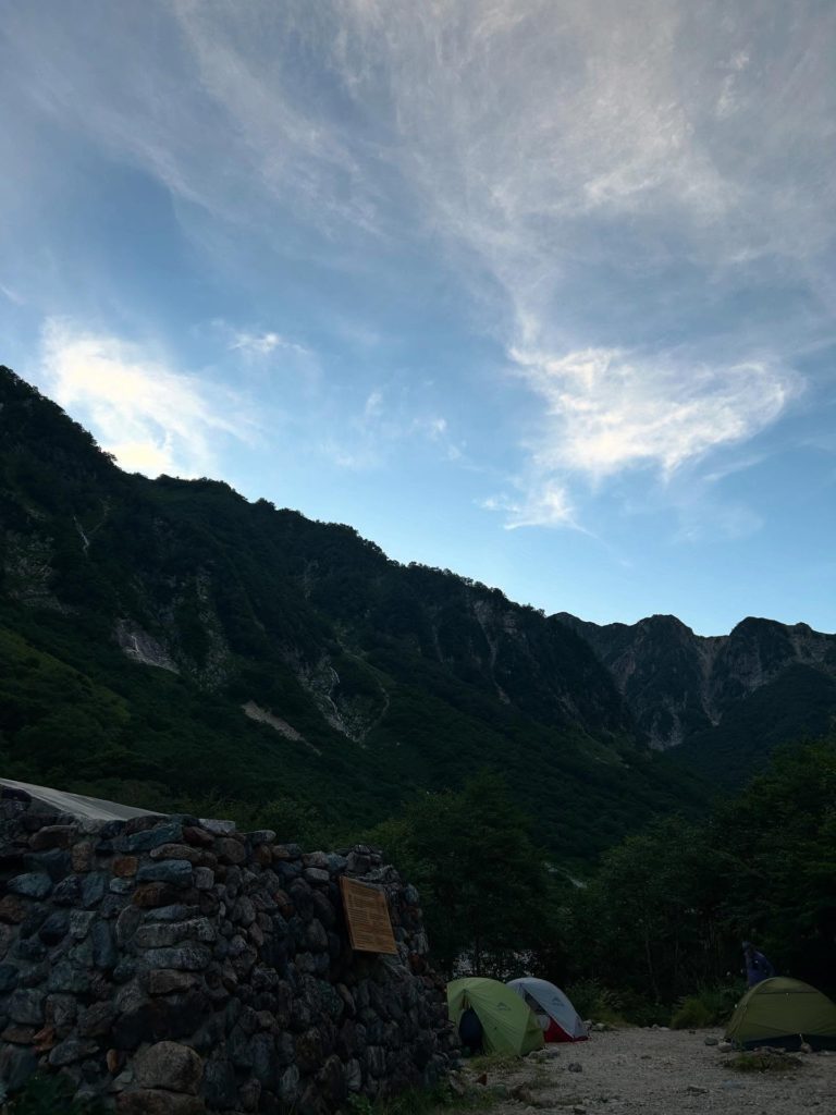 日が昇った後は、軽めの朝ごはんを食べ、テントを撤収し、下山開始。夕方のバスの時間までに上高地まで戻らねば。