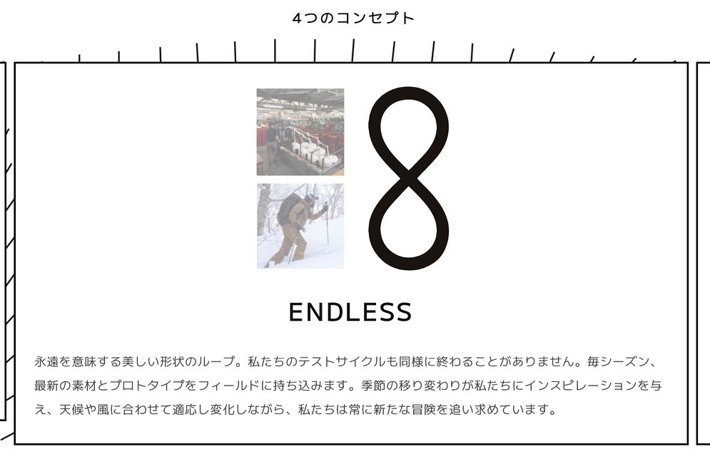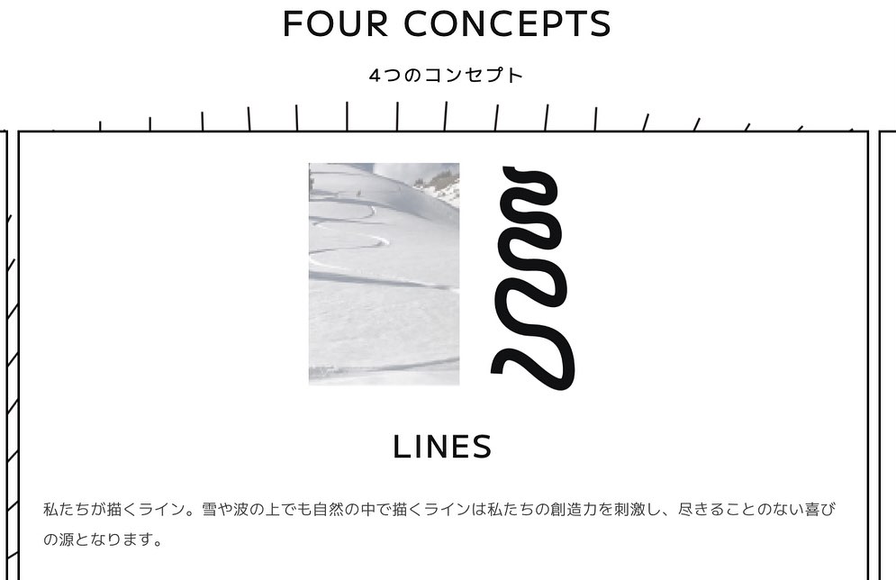 そして私たちの新しいロゴは、継続的にテストを繰り返し、改善し続けるという終わりのないモノづくりの姿勢を表しています。無限に連続するループは季節の変化と自然界のサイクルを象徴し、私たちはそこから新たなインスピレーションを得て、それを製品開発に反映することで、あらゆる季節やコンディションに適応する汎用性と耐久性ある製品を生み出します。 また大小さまざまなアールで構成された曲線は、雪や波に刻まれるラインを意味しています。雪山や波のうねりは、私たちが創造性を発揮するキャンバスです。 手付かずの真白い斜面に自らの痕跡を刻み込むのです。