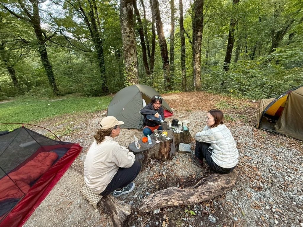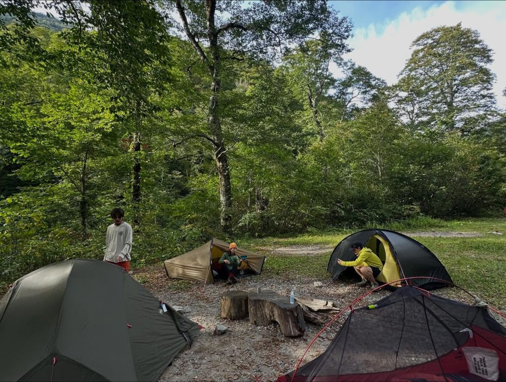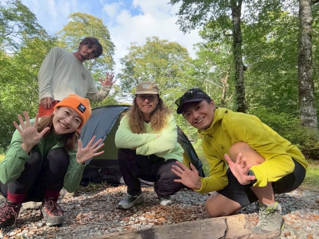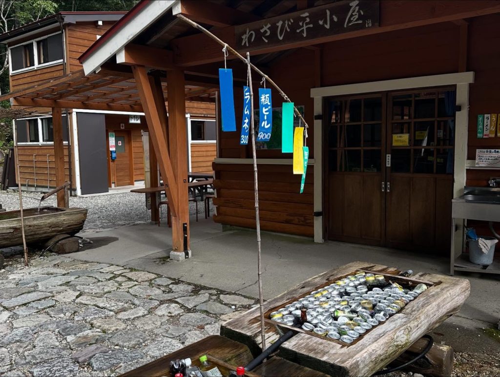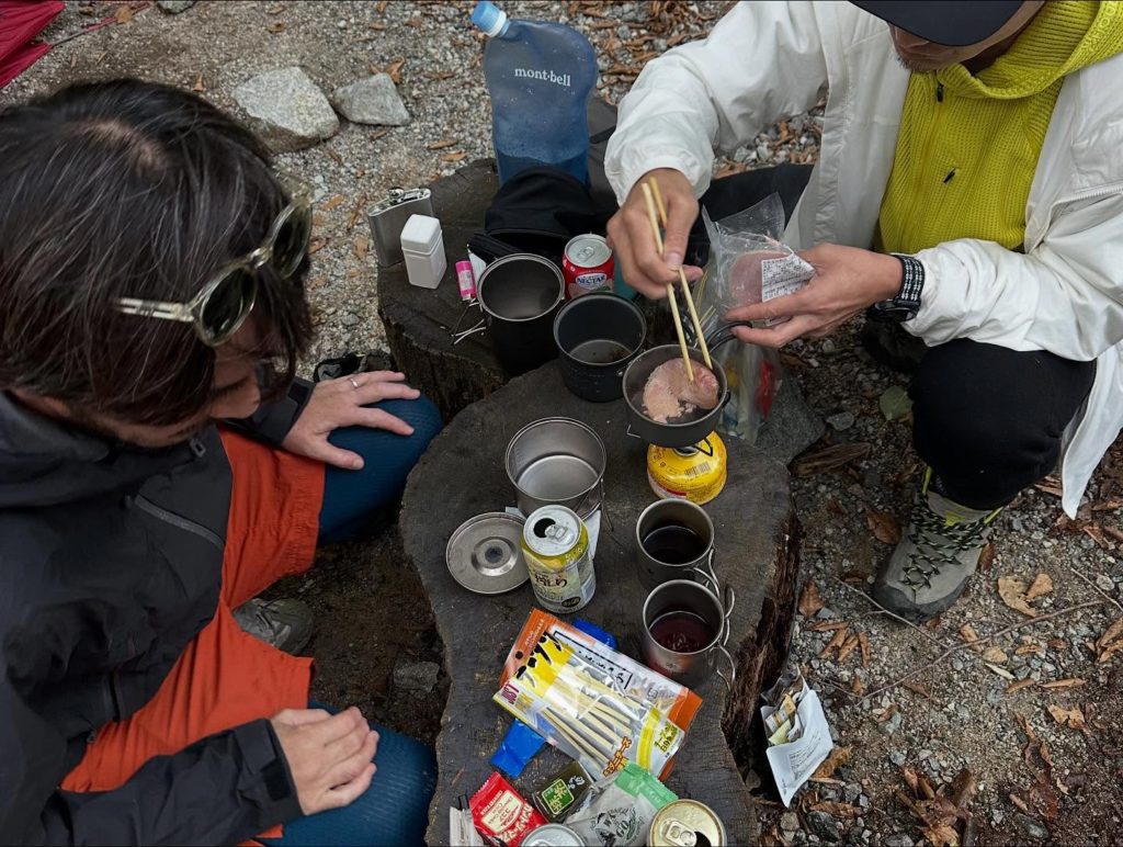 やがて、わさび平小屋に着く。いつもなら通過する場所、ゆっくりできるのは絶好の機会だ。テント設営後は、食事とお酒を楽しみ、楽しい夜に♪