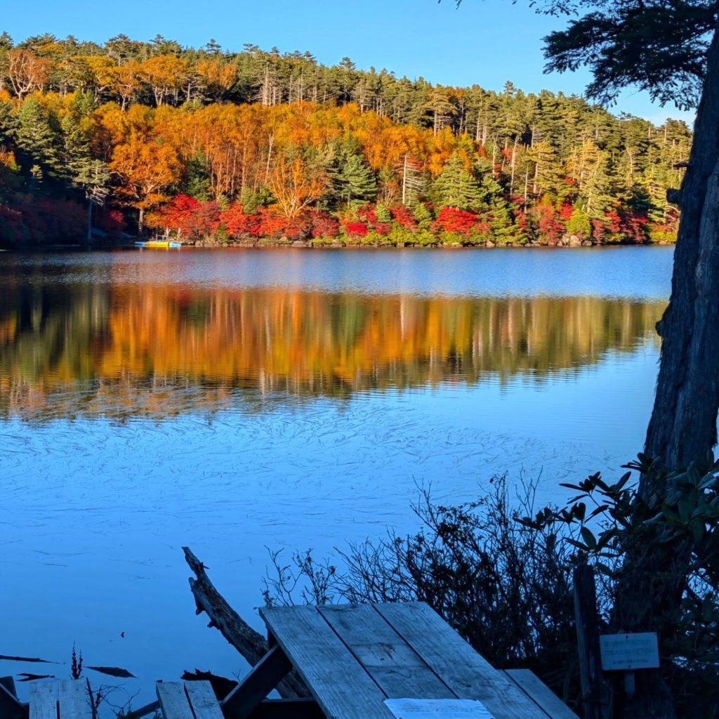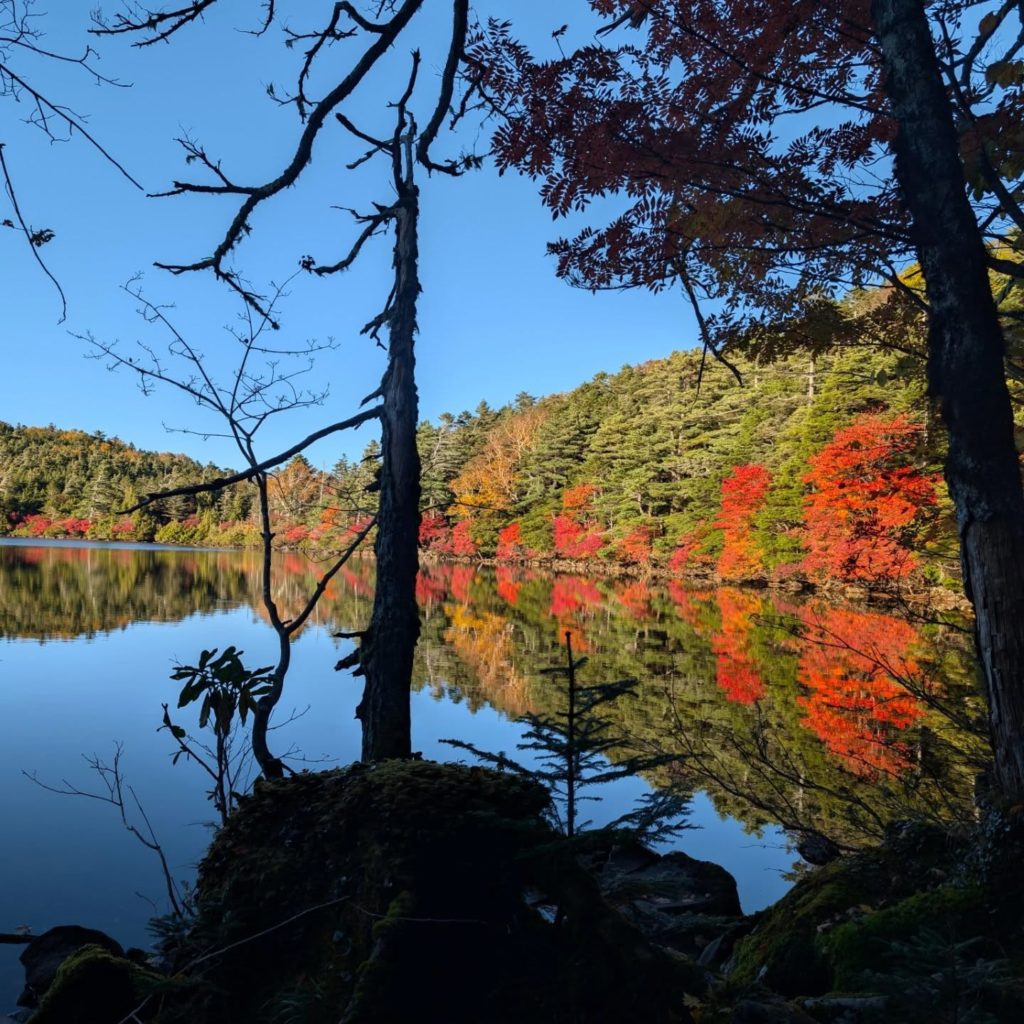 それでも、湖畔から眺めた紅葉の森はまさに見頃で、水面に映る木々の色が幻想的な光景をつくり出していました。
