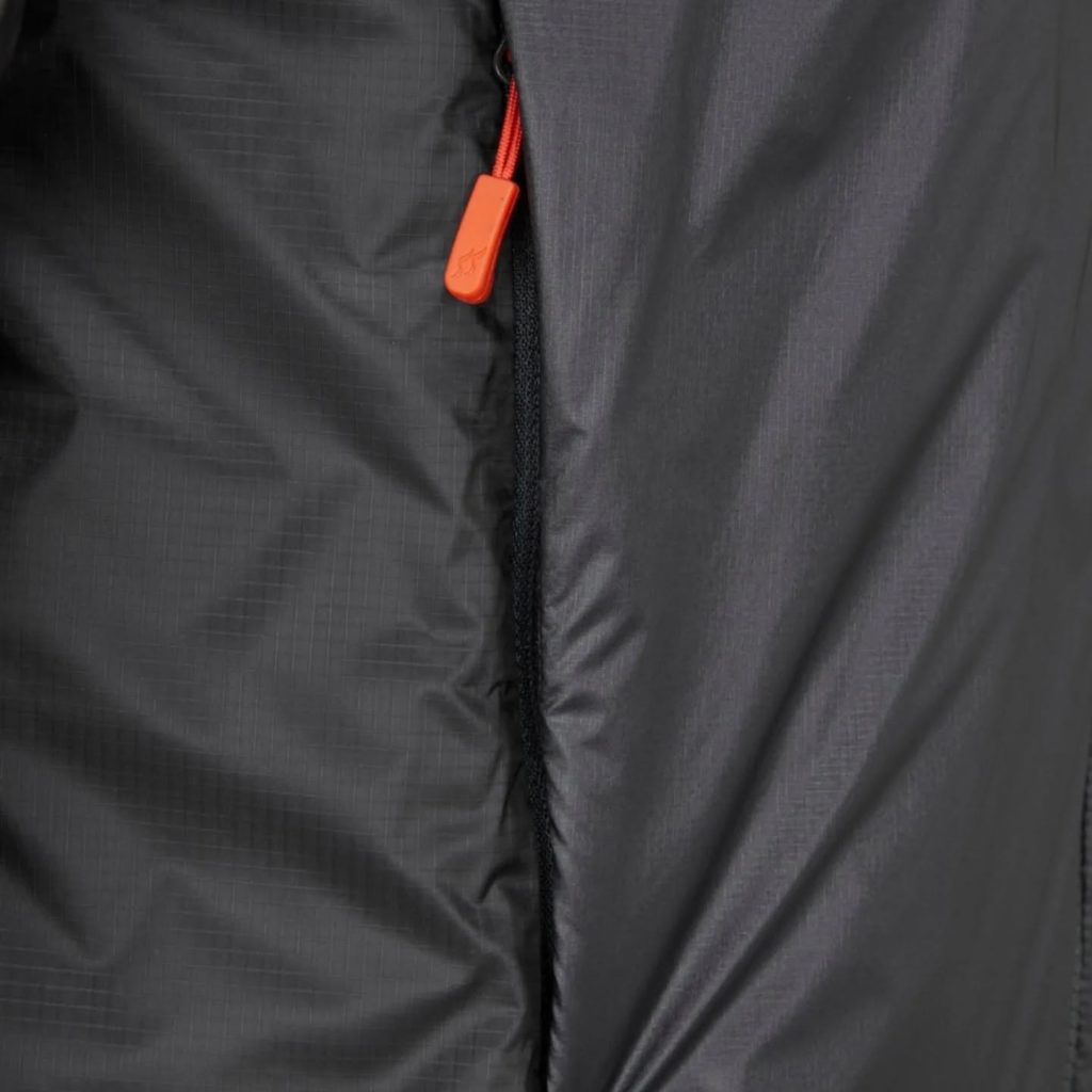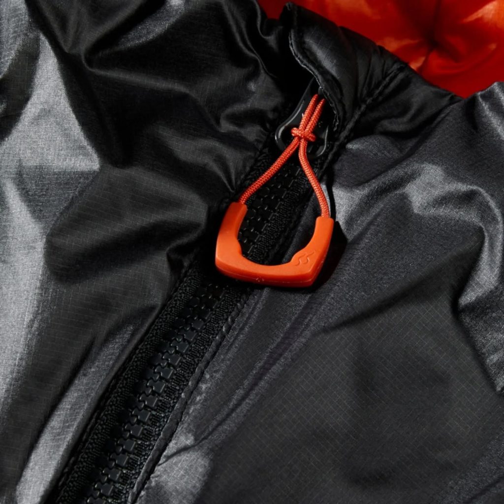 表地にはリップストップナイロンを使用し、優れた防風性と耐久性を確保。