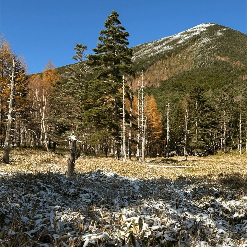 蓼科山は常に見え隠れし、唐松の黄金色、霧氷の白、そして青空・・・・雪、霧氷、エビのしっぽ、見事な紅葉・・・