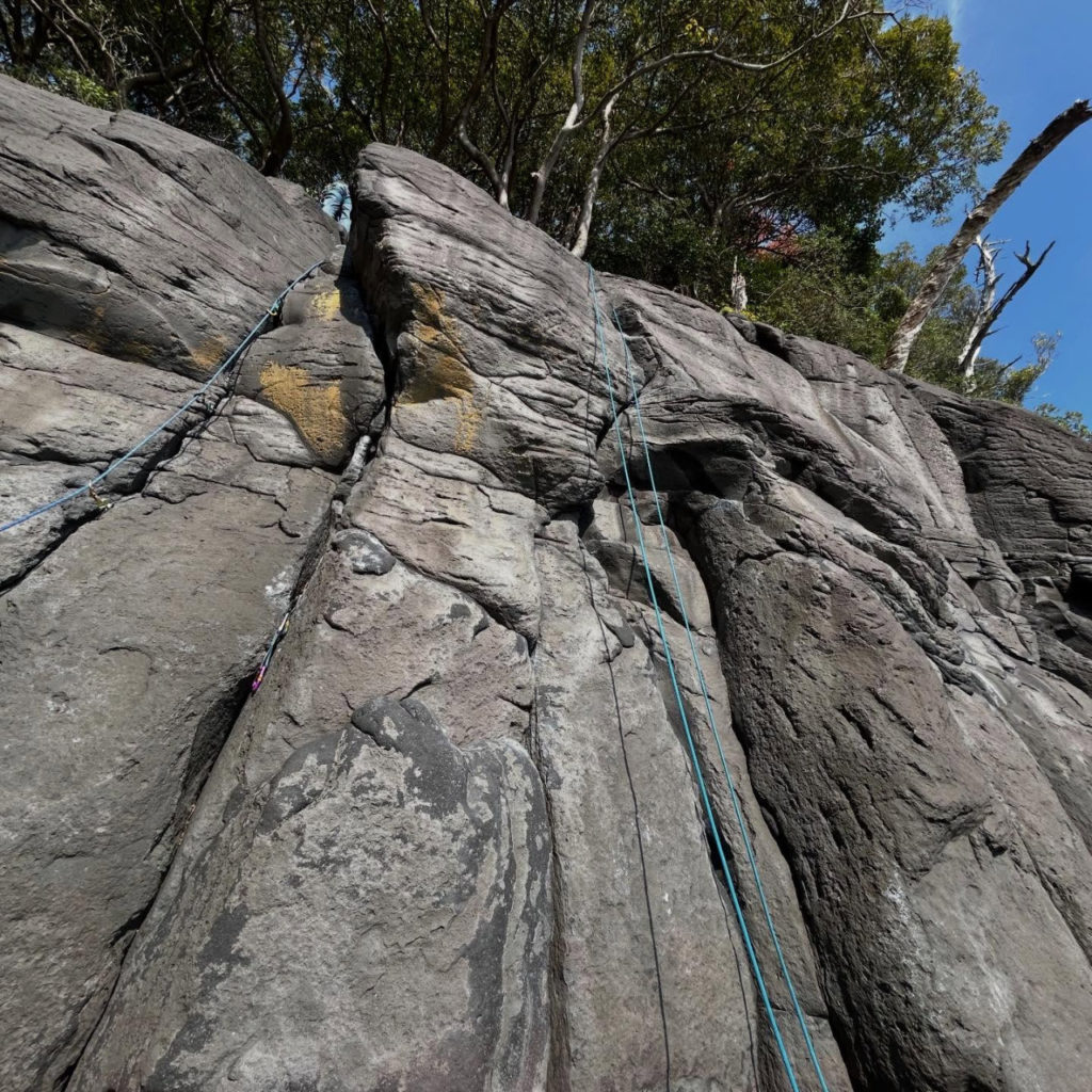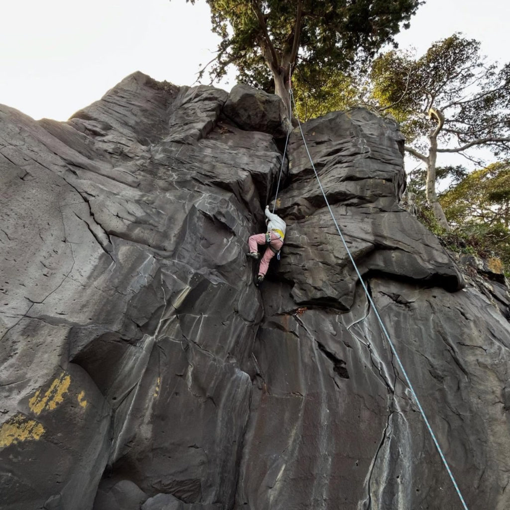 一年ぶりの安山岩の感触を思い出しながら、海を背にしてのクラッククライミング。