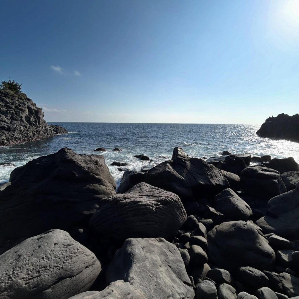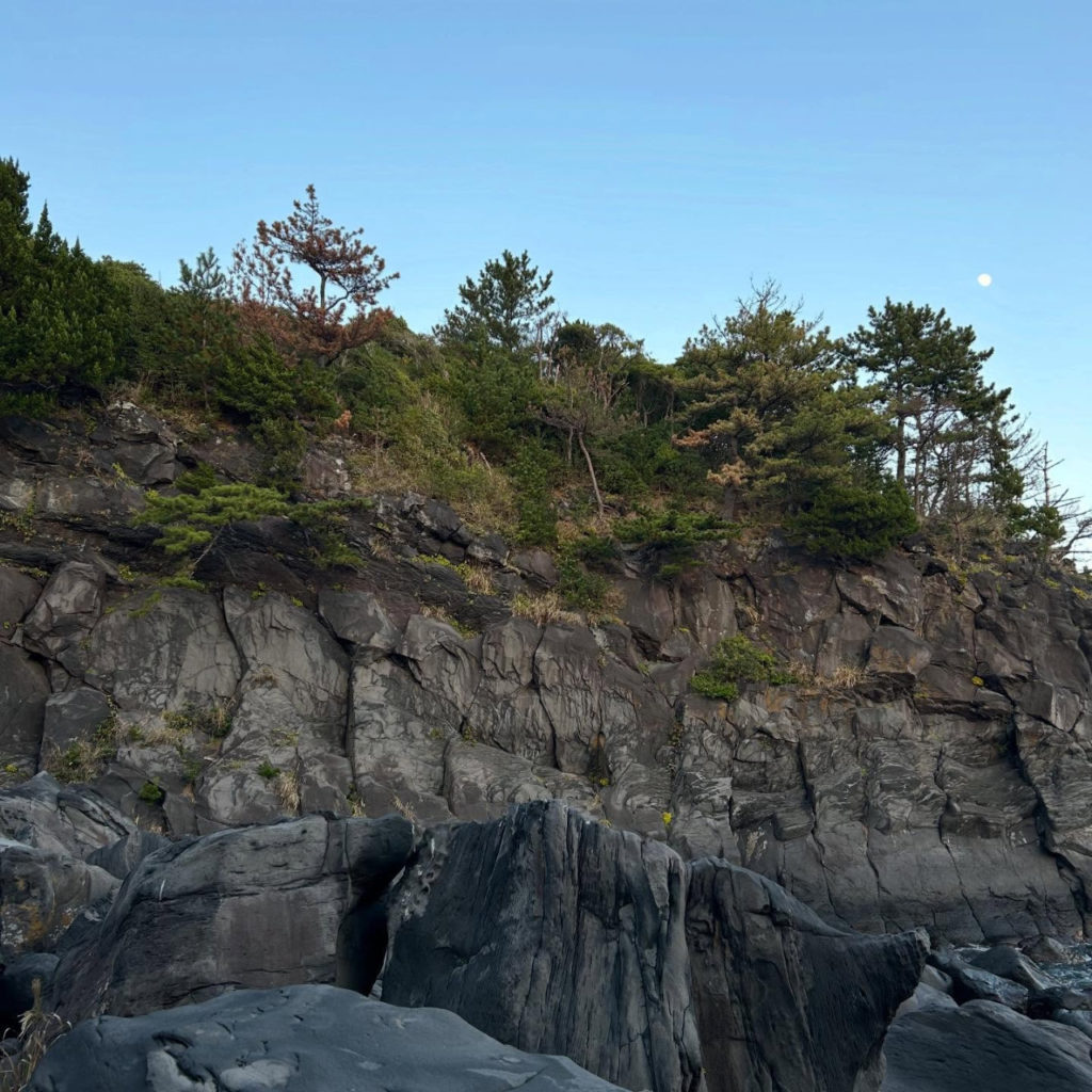 松の木、ツワブキ、イソギク、イソヒヨドリ、灰色の柱状節理に無数にクラックがはしる岩場と城ヶ崎らしい景色に、ただいま!おかえり!!みたいな感覚になりました。