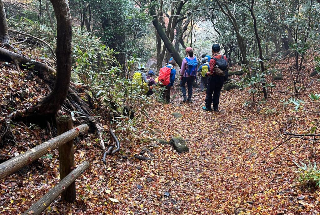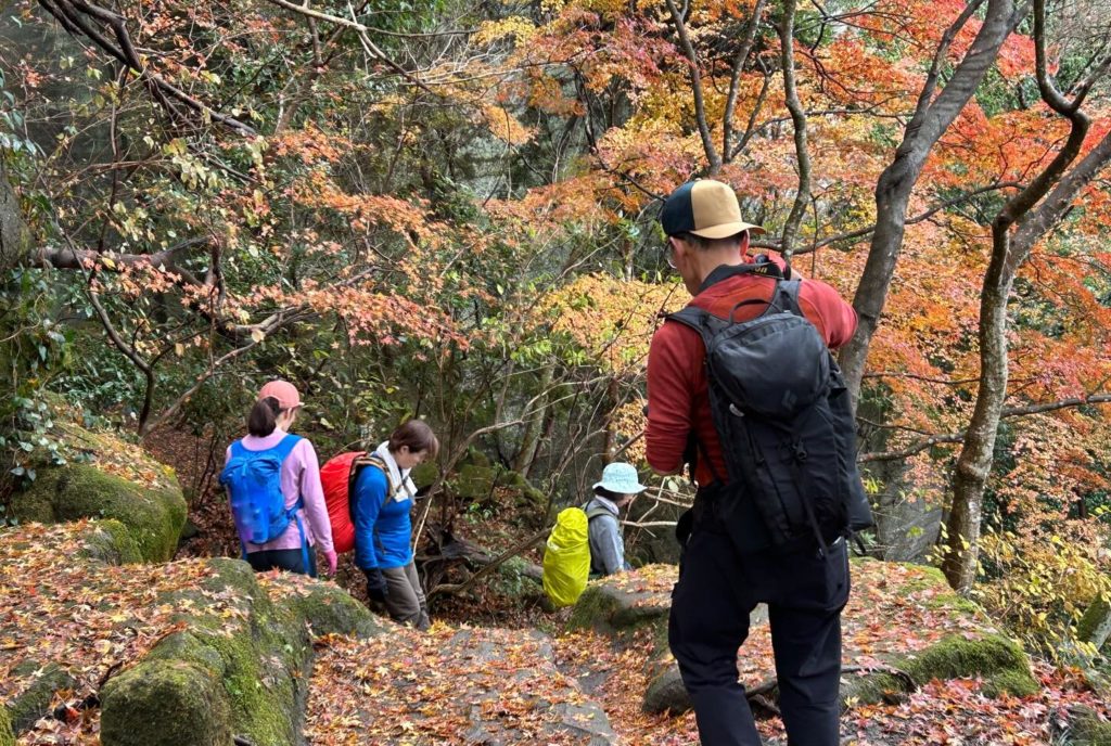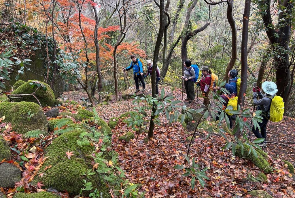 鋸山は今紅葉の最盛期、登山道脇の苔むした岩に