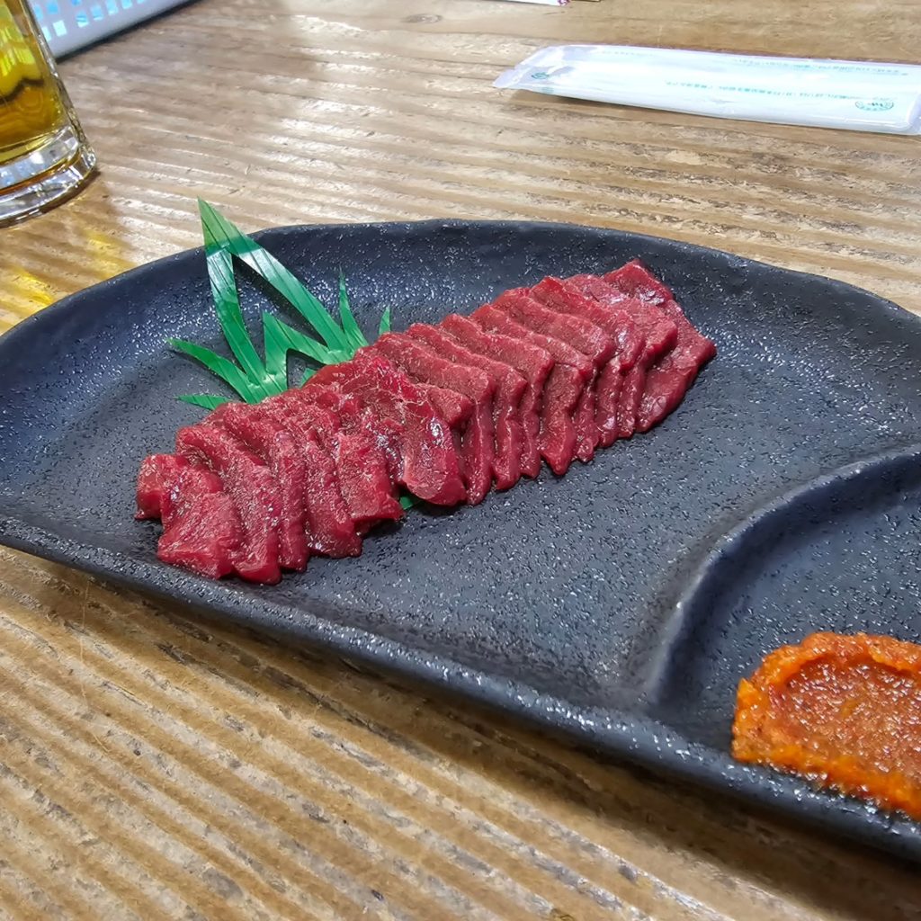 下山後は足を延ばしてもうひとつの目的、馬刺しを目指して満腹に。